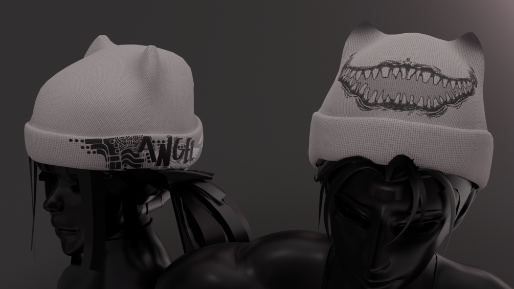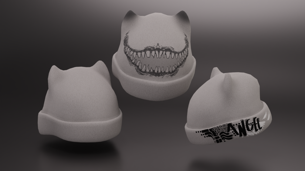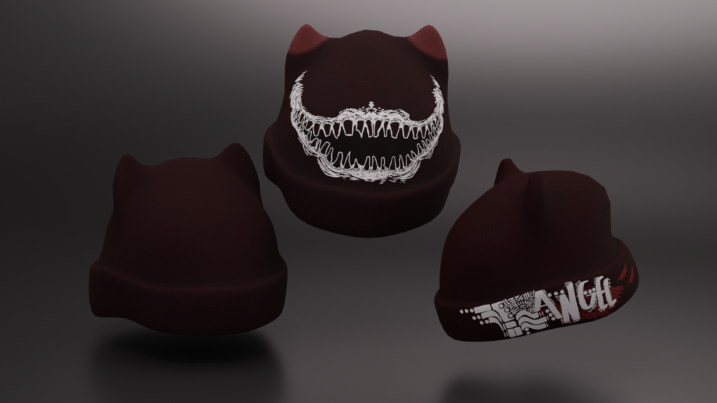 Beanie Fbx, 3 different designs (plain, Angel, monster mouth), 4 different Colours (Black, White, Red)